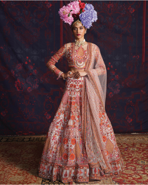 Light grey, tulle lehenga with silver foil work and silk threads, styled with a handcrafted blouse with organza flowers, crystals and feather finishing; and a tulle dupatta with foil detailing.
